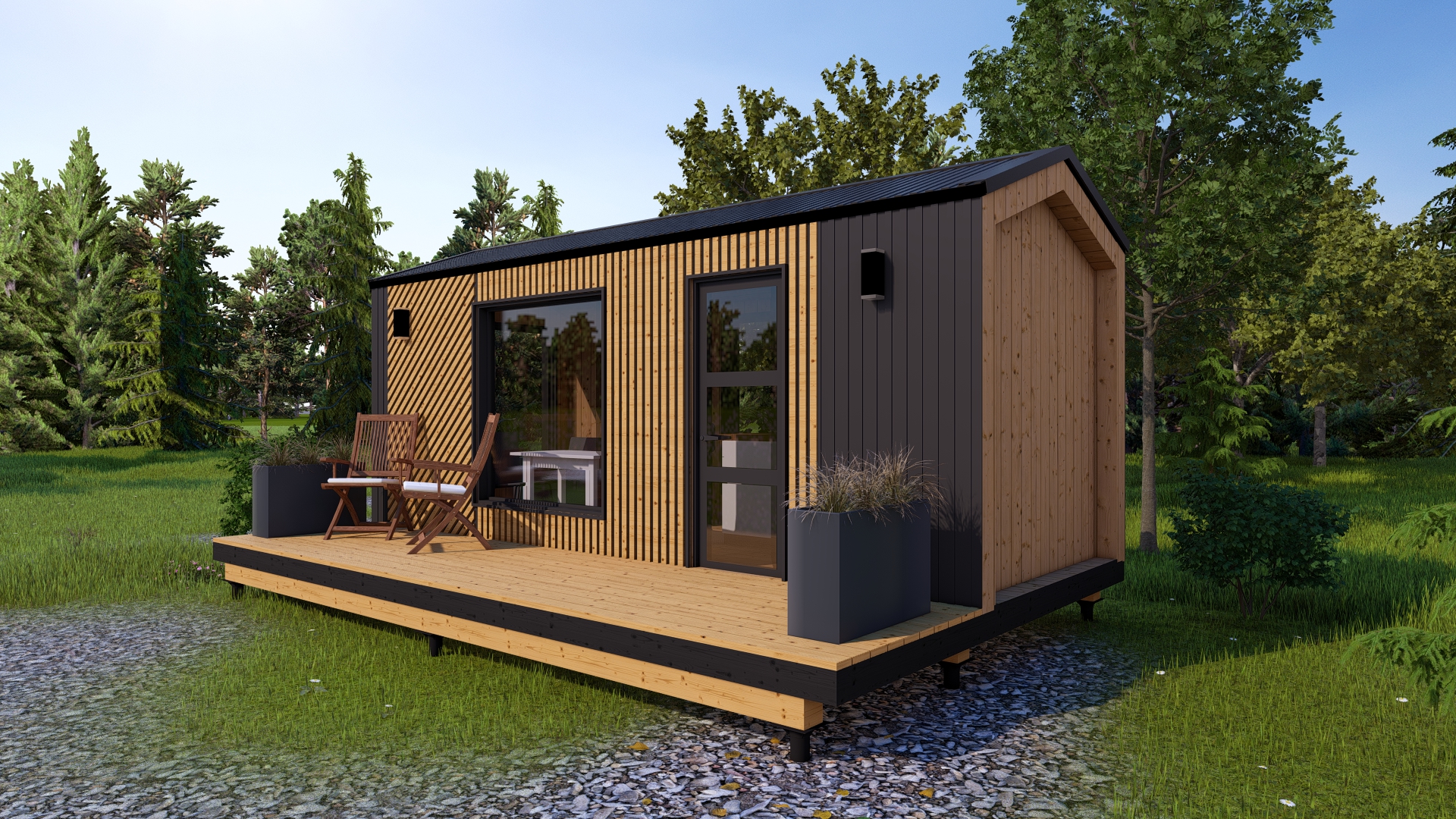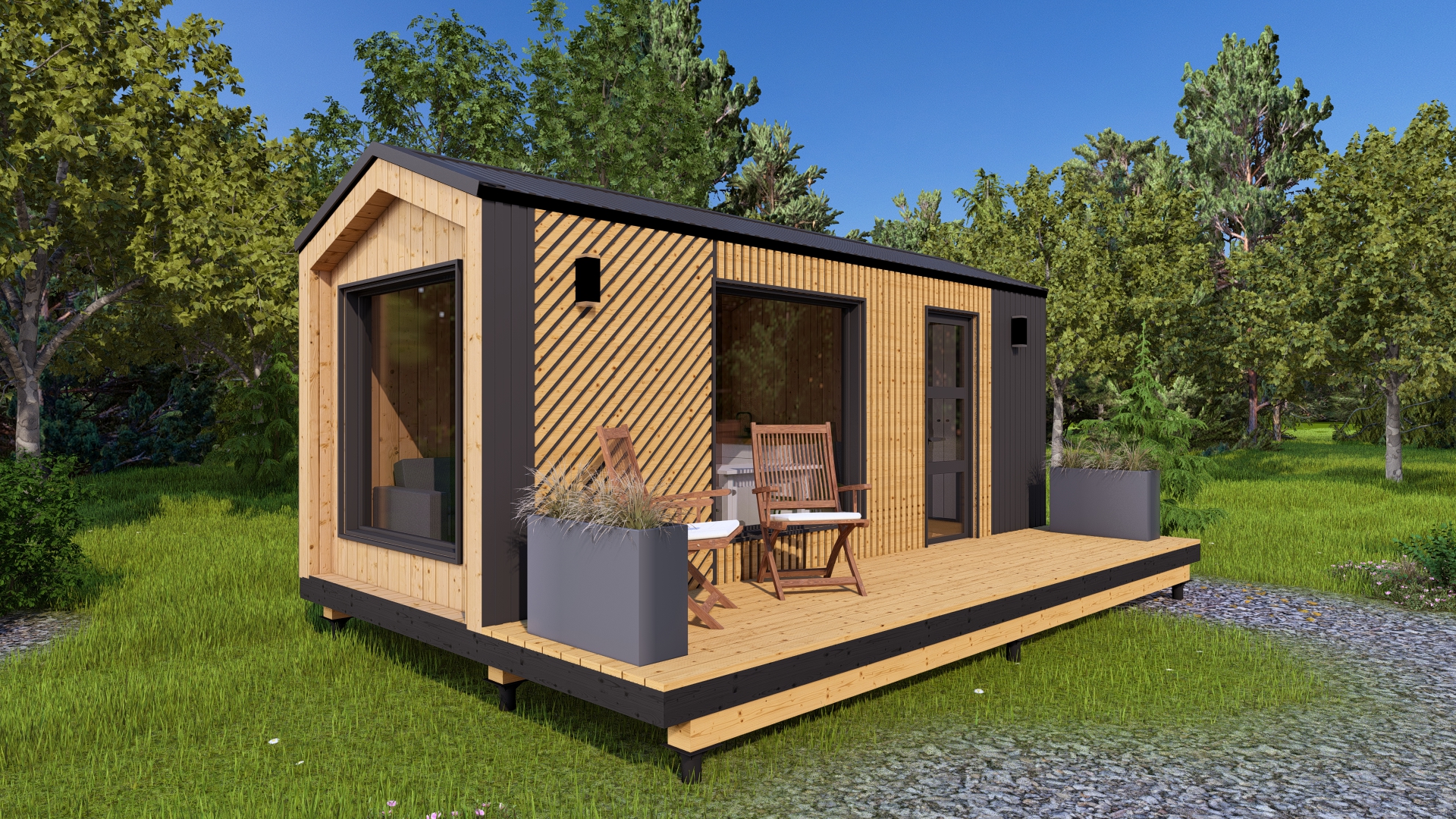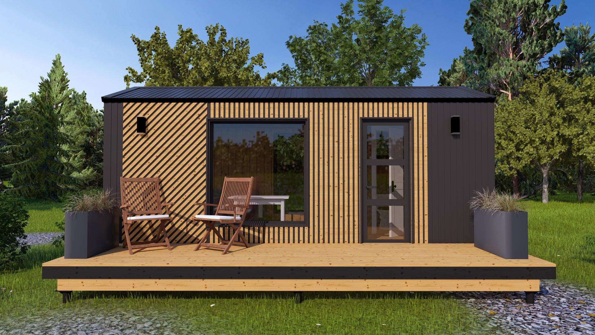 - Наружная отделка - проф.лист комбинированный с деревянными рейками, покрытыми маслом;