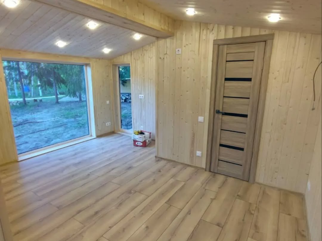 - Внутренняя отделка - стены и потолок имитация бруса, окрашены лессирующим составом (цвет на выбор);